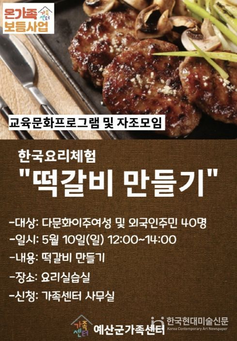한국현대미술신문 신정은 기자 | 예산군가족센터는 지역 내 결혼이주여성과 외국인 주민의 한국문화 이해 증진과 안정적인 정착 지원을 위해 오는 5월 10일 한국전통요리 체험 ‘떡갈비 만들기’ 프로그램을 운영한다고 밝혔다.