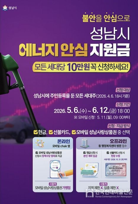 한국현대미술신문 배윤섭 기자 | 성남시는 중동 사태에 따른 국가 자원안보 위기 경보 발령으로 경제적 부담이 커진 시민들을 지원하기 위해 전국 최초로 ‘성남시 에너지 안심지원금’을 오는 5월 6일부터 신청을 받는다고 밝혔다.