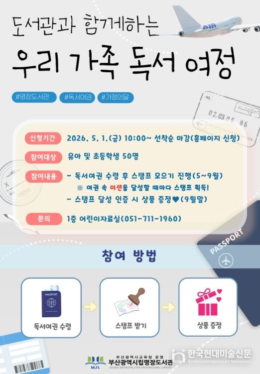 한국현대미술신문 정소영 기자 | 부산광역시립명장도서관은 가정의 달을 맞아 오는 5월 12일부터 9월 6일까지 유아 및 초등학생 50명을 대상으로 가족 참여형 독서 프로그램 ‘도서관과 함께하는 우리 가족 독서 여정’을 운영한다.
