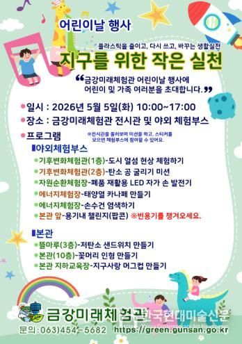 한국현대미술신문 기자 | 군산시 금강미래체험관이 어린이날을 맞아 5월 5일 오전 10시부터 오후 5시까지 체험관 전시관과 야외 체험부스 일원에서 어린이 및 가족 단위 관람객을 대상으로 어린이날 기념 환경체험 프로그램 ‘지구를 위한 작은 실천’을 운영한다.