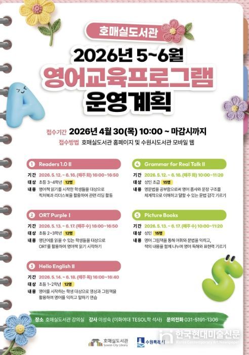 한국현대미술신문 배윤섭 기자 | 수원시 호매실도서관이 5~6월 영어교육 프로그램 참가자를 모집한다. 이성숙 강사(이화여대 TESOL학 석사)가 강의한다.