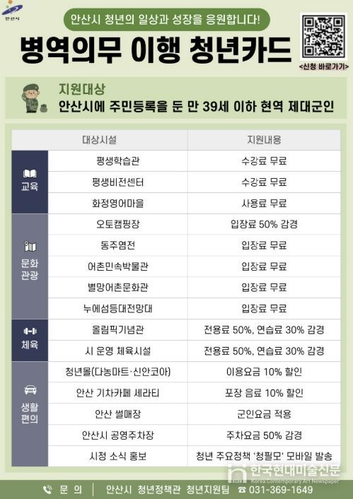 한국현대미술신문 배윤섭 기자 | 안산시는 병역의무를 성실히 이행한 청년들을 위해 운영 중인 ‘병역의무 이행 청년카드’의 혜택을 오는 5월부터 대폭 확대한다고 30일 밝혔다.