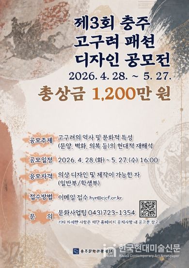 한국현대미술신문 신정은 기자 | (재)충주문화관광재단은 고구려 역사와 문화를 현대적 패션으로 재해석하는 '제3회 충주 고구려 패션 디자인 공모전'을 개최한다.