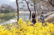 한국현대미술신문 신정은 기자 | 충북 괴산군 괴산읍 동진천변 산책로에 봄꽃이 피어 나들이객들의 발길이 이어지고 있다. 개나리 뒤편 산책로를 따라 연분홍빛 벚꽃도 꽃망울을 터트리기 시작해 봄 정취를 더한다. 전경에 가득 찬 개나리 물결 사이로 가족 단위 나들이객들이 산책을 즐기고 있다. 동진천은 화사한 봄꽃에 이어 음악분수, 미디어파사드, 괴산오작교를 비롯한 수변 공간을 두루 갖춰 주야간 내내 주민과 방문객에게 사랑을 받고 있다.