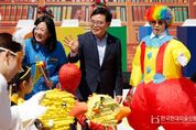 한국현대미술신문 배건 기자 | 진교훈 서울 강서구청장이 25일 방화근린공원 일대에서 열린 ‘제14회 강서어린이 동화축제’를 찾아 아이들과 시간을 함께했다. 진 구청장은 이날 축제의 시작을 알리는 ‘거리 퍼레이드’에 참여했다. 퍼레이드는 서울디지털콘텐츠고에서 방화근린공원까지 약 1㎞ 구간에 펼쳐졌다. 1천2백여 명의 참가자들이 이상한 나라의 앨리스, 미운 아기 오리 등 동화 속 의상을 입고 거리를 행진했다. 이어 진 구청장은 어린이 대표 3명 등과 본무대에 올라 ‘동화 세계의 문을 여는 개막 퍼포먼스’를 선보였다. 아이들과 음악에 맞춰 자리에서 일어나 펄쩍펄쩍 뛰는 등 격의 없이 소통하며 축제를 함께 즐겼다. 이날 방화근린공원은 삼삼오오 나들이를 나온 가족 단위 관람객들의 발길이 끊이질 않았다. 잔디밭마다 돗자리가 펼쳐졌고 도시락을 먹는 아이들, 동화 속 의상을 차려입은 아이들을 사진에 담으려는 모습들이 눈에 띄었다. 초등학생 아이와 함께 찾은 방화동 주민 김요환(40대) 씨는 “아이와 함께 특별한 추억을 만들고 싶어 4년째 동화축제에 참여하고 있다”고 말했다. 김 씨의 딸 김한나 양(송화초3)은 “
