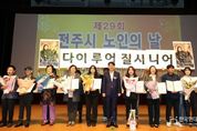 한국현대미술신문 기자 | 100세 시대를 맞아 전주지역 노인들의 행복하고 건강한 노후생활을 함께 염원하는 노인의날 기념식이 열렸다. 전주시와 대한노인회 전주시지회(지회장 홍성언)는 14일 전주학생교육문화관 공연장에서 우범기 전주시장과 최주만 전주시의회 부의장, 김두봉 대한노인회 전북특별자치도연합회장, 표창 수상자 등 1200여 명이 참석한 가운데 ‘제29회 전주시 노인의날 기념식’을 가졌다. 송민주 대한노인회 전주시지회 사무국장의 사회로 진행된 이날 기념식은 △무지개예술자원봉사단(단장 고대현)과 아름다운 실버 전주의꽃(단장 김인식)의 식전 공연 △노인 강령 낭독 △청려장(장수지팡이) 수여 △전주시장 및 전주시의장 표창 수여식 △노인복지공로자에 대한 공로장 수여식 등의 순으로 진행됐다. 특히 우범기 전주시장은 이날 기념식에서 올해 100세를 맞이한 김옥순 어르신(여, 덕진동)에게 무병장수의 상징인 청려지팡이를 전달했으며, 홍성언 지회장은 축하의 꽃다발을 선물했다. 홍성언 대한노인회 전주시지회장은 “풍성했던 한가위도 지나가고, 땀과 노력으로 이뤄낸 결실의 계절 가을을 맞이해 참석해 주신 우범기 전주