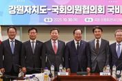 한국현대미술신문 원진 기자 | 김진태 강원특별자치도지사는 10월 30일 오후 2시, 국회 의원회관에서 도내 지역구 국회의원 7명과 함께 도 국회의원협의회를 열고 2026년도 국비 추가 확보 방안 등을 논의했다. 이번 간담회는 2026년도 정부예산안의 국회 심의가 본격화되는 시점에 맞춰 도와 지역 국회의원 간 협력체계를 강화하기 위해 마련된 자리로, 김 지사를 비롯해 지역구 국회의원 보좌진이 참석해 예산 확보 전략을 중심으로 실무적인 논의를 진행했다. 이 자리에서 도는 올해 국비 10조 원 시대를 처음으로 연 성과를 바탕으로 정부 예산안에 미반영된 24개 사업(총 612억 원)의 국비 추가 확보 방안을 논의하고, 해당 사업들이 국회 심의 과정에서 반드시 반영될 수 있도록 국회의 적극적인 협력을 요청했다. 이와 함께 ▲용문~홍천 광역철도 예타 통과 ▲삼척~강릉 고속화철도 예타 통과 ▲포천~철원 고속도로 예타 통과 ▲소양8교 건설 국비 반영 ▲제5차 국가철도망 구축계획 및 제6차 국도‧국지도 건설계획 최대 반영 등 강원지역 주요 에스오시(SOC) 현안과제에 대해서도 폭넓은 논의가 이뤄졌다. 한기호 국회의