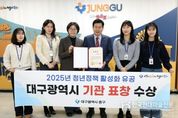 한국현대미술신문 정소영 기자 | 대구 중구는 ‘2025년 청년정책 활성화 유공’ 분야에서 대구광역시 기관 표창을 받았다고 밝혔다. 대구시는 청년정책 전담 부서를 신설한 2017년 이후, 우수한 청년정책 추진 성과를 거둔 기초자치단체를 대상으로 표창을 수여한다. 대구 중구는 청년 주거 안정과 경제적 부담 경감을 위해 청년 사업자 임대료 지원, 청년 부동산 중개보수 및 이사비 지원 등 지역 정착형 사업을 대구 지역 지자체 최초로 추진해 왔다. 또한 행정안전부 주관 ‘2025년 청년마을 만들기’ 공모사업에 선정돼 청년친화도시 기반을 마련했으며, 청년 소통과 교류의 거점인 중구 청년지원센터 ‘잇플’을 개소해 청년 활동 공간을 확충했다. 이와 함께 ‘중구 청년의 날’ 행사와 청년 팝업 클래스 등 청년 맞춤형 문화 행사를 운영하고, 2030 청년창업지원센터와 북성로 청년창업클러스터를 중심으로 청년 친화형 일자리 환경과 창업 기반을 구축하는 등 다양한 분야에서 청년을 위한 실질적인 정책을 추진했다. 아울러, 중구보건소와 대구행복기숙사 간 ‘청춘 心쿵 프로젝트’ 업무협약을 체결하는 등 청년 건강증진을 위한 정책도