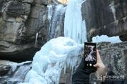 한국현대미술신문 신정은 기자 | 충북 괴산군 조령산 자락에 위치한 수옥폭포가 연일 이어진 강추위 속에서 거대한 빙폭과 고드름으로 뒤덮이며 한겨울에만 볼 수 있는 장관을 연출하고 있다. 폭포 절벽을 따라 흐르던 물줄기는 얼어붙어 층층이 이어진 얼음 기둥을 형성했고 암벽 곳곳에는 고드름이 달려 웅장한 겨울 풍경을 완성했다. 폭포 상단에서 떨어지던 물은 하단부로 갈수록 얼음과 눈이 겹겹이 쌓이며 계곡 전체를 고요한 겨울 풍경으로 바꿔 놓았다. 거친 암벽과 새하얀 얼음이 선명한 대비를 이루며 자연이 만들어낸 조형미를 고스란히 보여주고 있다. 수옥폭포는 사계절 내내 다양한 풍경을 감상할 수 있는 괴산의 대표적인 자연 명소로 특히 겨울에는 빙폭이 형성돼 사진 촬영과 겨울 산행을 즐기는 방문객들의 발길이 이어지고 있다. 군 관계자는 “수옥폭포는 자연이 만들어낸 특별한 명소”라며 “겨울이 지나기 전에 많은 분들이 찾길 바란다”고 말했다.