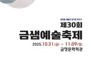 한국현대미술신문 정소영 기자 | 부산시 금정구가 주최하고 금정구 문화예술인협의회(회장 도태근)가 주관하는 10월 31일부터 11월 9일까지 금정문화회관 은빛샘홀, 금샘미술관 전시실, 야외광장에서 ‘제30회 금샘예술축제’를 개최한다. 금샘예술축제는 국악·무용·문인·미술·사진·서예·연극·연예인·음악 등 9개 협회로 이루어진 금정구 문화예술인협의회에서 주관하는 지역대표 문화예술축제로, 30년째 매년 가을, 금정구 예술인들의 수준 높은 공연과 전시로 금정구 문화예술의 품격을 높여온 순수 종합예술축제다. 10월 31일 금정문화회관 은빛샘홀에서 개막 공연인 연극협회의 ‘늙은 자전거’를 시작으로, 11월 1일 음악협회의 ‘금샘열린음악회’, 11월2일 연예인협회의 ‘금정구민 현장노래방’이 진행된다. 아울러, 10월 31일부터 11월 9일까지 금샘미술관 전시실과 야외광장에서 서예협회의 ‘금정구서예인협회전’, 사진협회의 ‘금샘사진전’, 문인협회의‘깃발시화전 '파란 하늘 아래 시어가 펄럭이다'’이 진행된다. 올해 예술제에 참여하지 않은 국악협회, 무용협회와 미술협회는 내년에 더욱 풍성하게 준비하여 참여할 예정이다. &