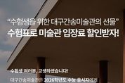 한국현대미술신문 정소영 기자 | 대구간송미술관이 14일부터 26학년도 수능 수험생을 대상으로 다양한 혜택을 제공한다. 수험표를 지참한 수험생에게는 미술관 입장료 최대 30% 할인 혜택(동반 1인 포함)이 제공되며, 이벤트 참여 시 다양한 기념품도 증정된다. 이와 함께 방송인 서경석, 영화감독 이준익이 참여하는 ‘간송예술강좌’를 개최하여 전시에 대한 다양한 의미를 되돌아보는 특별한 시간을 가진다. 수험생 대상 입장료 30% 할인(동반 1인 포함) 및 참여형 이벤트 진행, 11월 14일부터 수험생 입장료 30% 할인은 수능 다음날인 11월 14일부터 12월 31일까지 진행된다. 현재 미술관에서 전시 중인 광복 80주년 기념 기획전 《삼청도도 – 매·죽·난, 멈추지 않는 이야기》와 상설전 모두 할인 혜택을 받을 수 있다. 수험생 우대를 받기 위해서는 수능 수험표, 수시 합격증 등 수험생임을 증명할 수 있는 증빙서류를 매표소에 제시하면 된다. 이와 함께 미술관은 다양한 참여 이벤트를 마련했다. 연말까지 수험생 우대를 받고 입장한 선착순 250명에게 간송 대표 소장품이 담긴 컬러링 북을 선물한다. 더불어 대구간송미술관