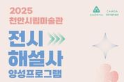한국현대미술신문 신정은 기자 | 천안문화재단은 내달 4일부터 ‘2025 전시해설사 양성프로그램’ 참여자를 선착순 모집한다고 31일 밝혔다. 이번 프로그램에서는 작품과 관람객을 이어주는 전시해설사에 대한 이해와 관련 소양을 기르기 위한 이론과 실무 교육이 진행된다. 교육과정은 ▲한국 현대미술의 흐름과 이해(권영진) ▲도슨트 역할과 이해(김혜정) ▲한국근대미술의 흐름과 이해(권행가) ▲도슨트의 스크립트와 스피치(한이준)으로 구성됐다. 교육은 내달 20일부터 12월 11일까지 매주 목요일 오후 2시~ 4시 30분 천안예술의전당 문화센터에서 진행될 예정이다. 지원자격은 2025 전시해설사 양성프로그램에 참여한 경험이 없는 20세 이상 성인으로, 모집 인원은 총 40명이다. 교육과정 3회 이상 수강 시 수료증이 발급되며, 수료자에게는 내년도 천안시립미술관 문화자원봉사 지원 시 가산점이 부여된다. 자세한 내용은 천안시립미술관 누리집을 통해 확인할 수 있으며, 문의사항은 시각예술팀으로 하면 된다.