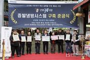 한국현대미술신문 신정은 기자 | 충북 단양군은 지난 24일 단양구경시장에서 ‘증발냉방(쿨링포그) 시스템’ 준공 기념 시연회를 개최했다고 밝혔다. 증발냉방 시스템은 정수 처리된 물을 미세한 안개 형태로 분사해 주변 온도를 3∼5도 낮추는 장치로, 피부나 옷이 젖지 않아 이용 편의성이 높다. 이를 통해 시장을 찾는 이용객과 상인의 온열질환을 예방하고, 식품 신선도 유지에도 도움이 된다. 이번에 단양구경시장에 설치된 시스템은 환경부 ‘2025년 기후위기 취약계층 지원 공모사업’에 선정되며 추진된 사업으로, 국비를 포함한 총 6억 원의 예산이 투입됐다. 아케이드 내 450m 구간에 공기순환용 팬 69개와 분무 노즐 8개소를 설치해 시장 전반의 냉방 효과를 높였다. 이날 시연회에는 시장 상인 등 30여 명이 참석해 냉방 시스템의 작동 상태를 직접 확인하고, 향후 운영 개선을 위한 의견과 애로사항을 청취하는 등 소통의 시간을 가졌다. 시연회와 함께 전통시장 내 ‘탄소중립 캠페인’도 병행해 장바구니 사용 권장과 에너지 절약 생활수칙 홍보, 탄소중립 실천 홍보물 배부 등 다양한 활동을 펼