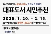 한국현대미술신문 신정은 기자 | 충주시립도서관이 시민 주도의 독서 문화 확산을 위해 2026년 제8회 '책읽는 충주' 독서 운동에 참여할 올해의 대표 도서를 공모한다. 올해로 8회째를 맞는 '책읽는 충주'는 선정된 도서를 매개로 지역사회가 소통하고 공감하는 시민 참여형 독서 캠페인이다. 대표 도서는 시민들이 제안한 추천 도서를 바탕으로 온․오프라인 투표와 도서관운영위원회 심의를 거쳐 일반 도서와 및 어린이 도서 부문에서 각 1권씩, 총 2권이 최종 선정된다. 도서 선정 기준은 △국내 생존 작가의 작품 △5년 이내 출간 도서 △3권 이상 연작 도서 제외 △(일반도서)다양한 계층이 공감할 수 있는 도서 △(어린이도서)유익하고 흥미로운 도서 등이다. 추천은 오는 9일까지 충주시립도서관 누리집을 통해 가능하며, 본관, 서충주도서관, 어린이청소년도서관, 분관, 작은 도서관에 비치된 추천서를 작성하여 제출해도 된다. 포스터에 안내된 QR코드를 활용하면 보다 쉽게 참여할 수 있다. 시 관계자는 “책읽는 충주는 기획 단계부터 시민의 목소리를 담아 완성되는 사업”이라며, “지역 사회의 독서